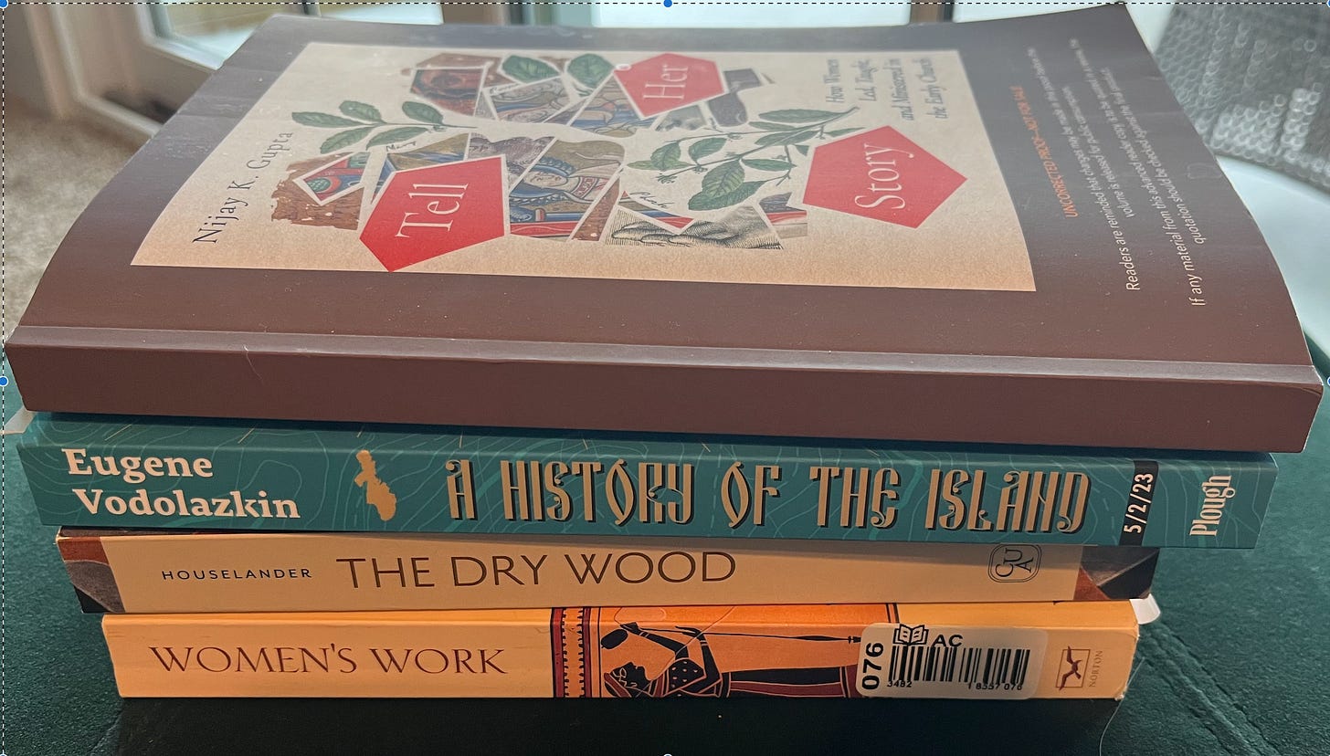 I plan to review A History of the Island. I will be a guest of the Collegium Institute on March 6 at 7PM ET to discuss Houslander’s Dry Wood; I’m loving this novel so far. The other two books are part of my continued investigation into women in Christianity and culture for my next book.